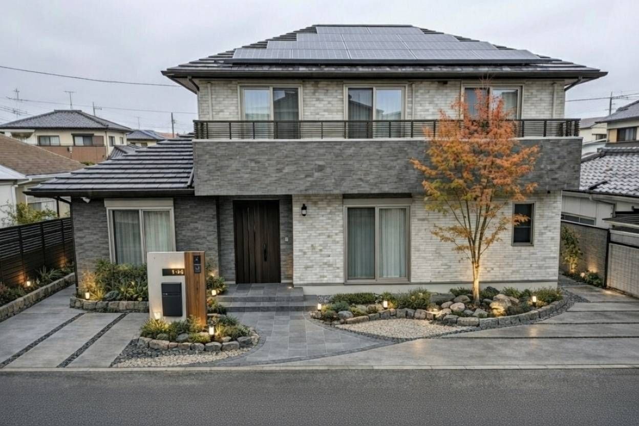 モノトーンタイルが映える、モダンな二階建て住宅
