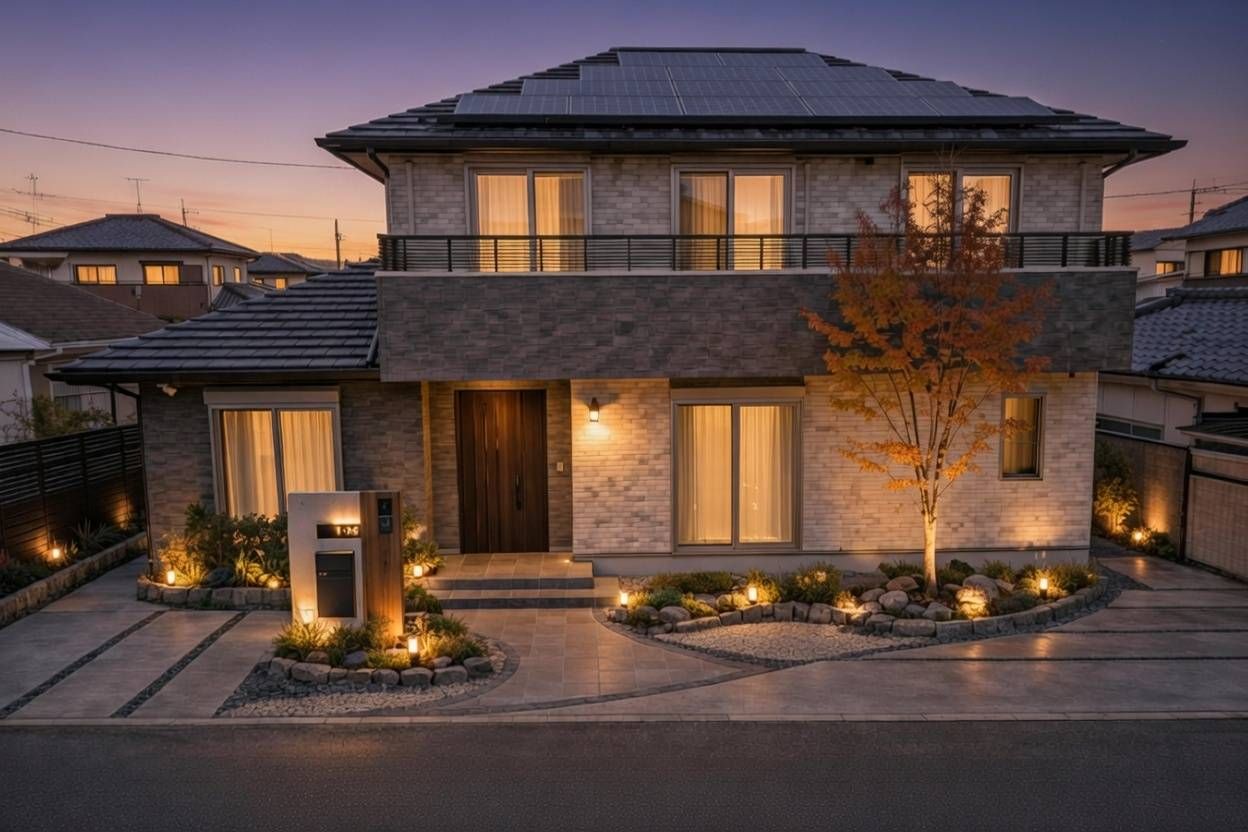 上質なタイル貼りが印象的な、落ち着きある二階建て住宅
